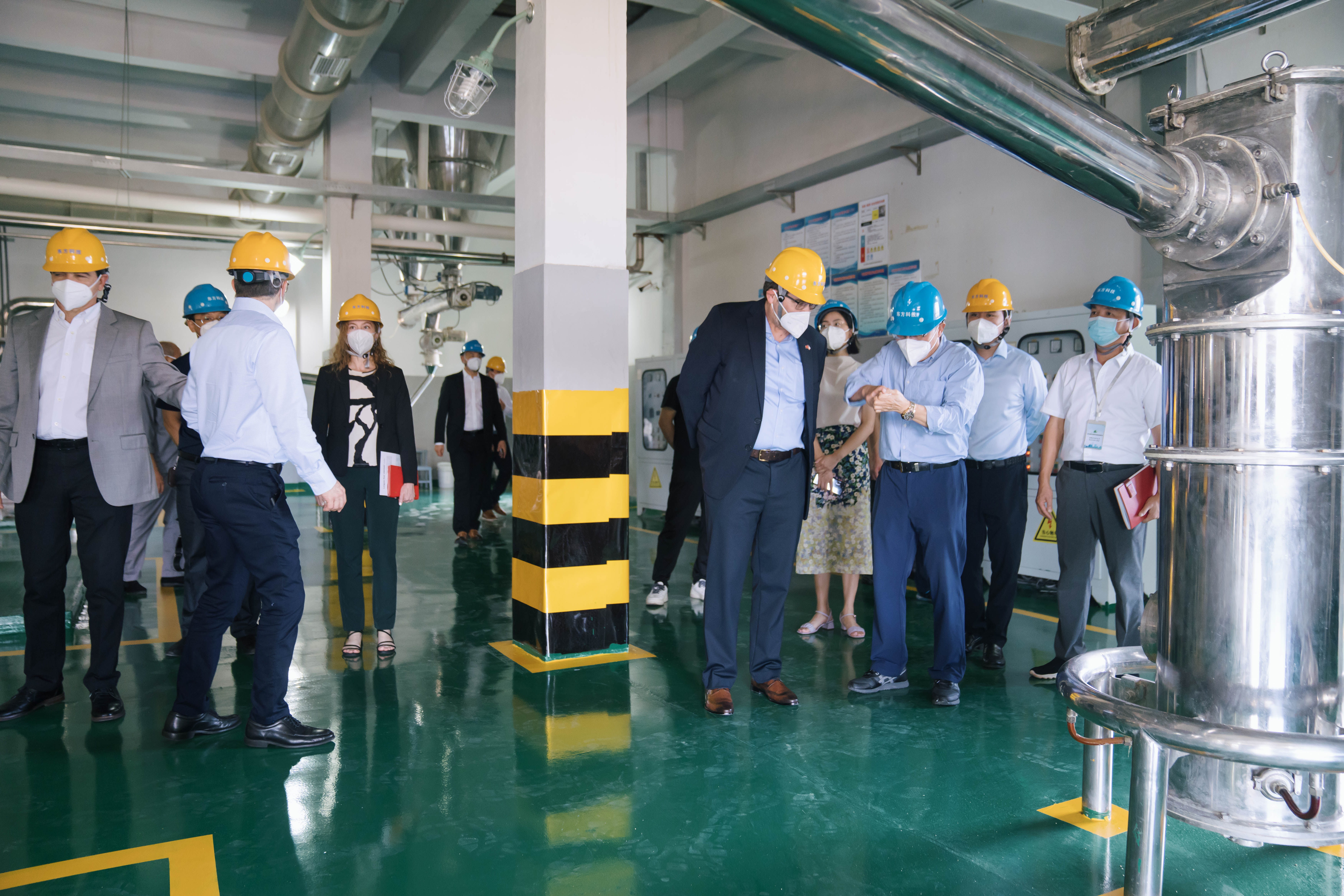 交流結(jié)束后,董事長帶著智利大使及其大使館官員、ASOEX總經(jīng)理一行,深入公司生產(chǎn)、質(zhì)檢各部門進行參觀。向各位展示了實驗室用的先進儀器和設(shè)備;車間生產(chǎn)用的一些設(shè)備更新與改造;比如全自動包裝生產(chǎn)線、年產(chǎn)1400噸的氣流粉碎裝置、日產(chǎn)量12千升的懸浮劑設(shè)備、中型生化污水處理系統(tǒng)等